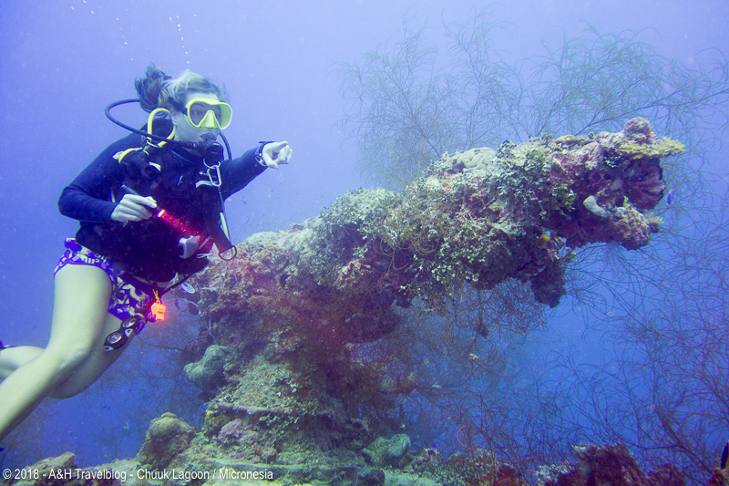 Coming back up the light greets us and we go and explore the bow of the ship. The huge bow gun is beautifully overgrown with coral and posing for pictures a curious eagle ray emerges from the blue and stays around for some minutes checking us out.
